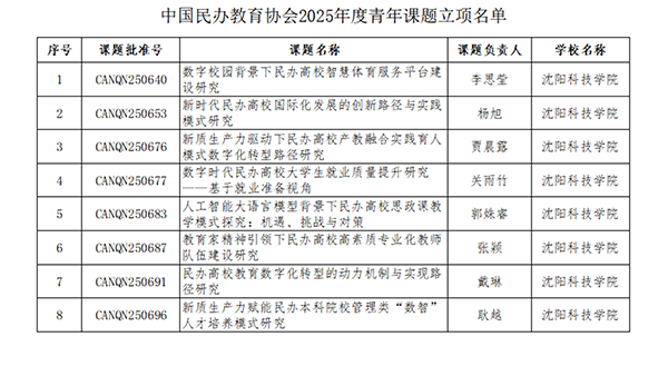 学校将以此次课题立项为契机,继续营造浓厚科研氛围,强化有组织科研,推动科研与教学深度融合,不断提升学校整体办学水平与核心竞争力,为我国民办教育高质量发展贡献更多“沈科力量”。