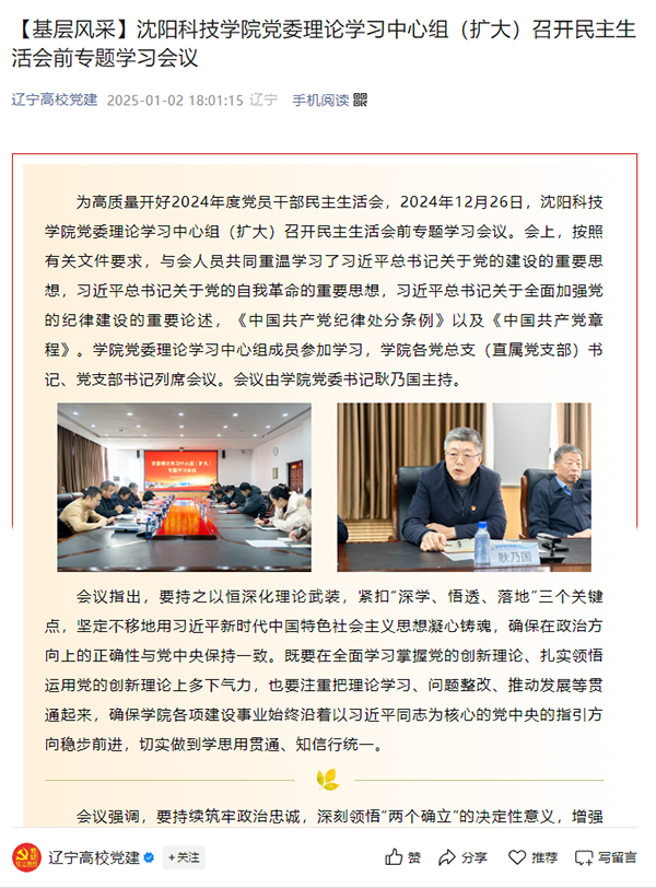 领航定向,融合赋能。学校党委积极在办学治校中充分发挥政治引领作用,党委书记进入董事会参与“三重一大”决策监督,确保党的教育方针和政策在学校各项工作中落地生根。通过把方向、管大局、作决策、抓班子、带队伍、保落实,将政治标准和政治要求贯穿学校事业发展全过程,形成“一突出五推进”党建工作思路,构建学校党建与事业发展“一融双高”新格局。2023年省委教育工委举办的第二届组织大赛,我校荣获集体三等奖。肖士中同志获得2021年辽宁省高校优秀党务工作者;徐鹏同志获得2021年辽宁省高校优秀共产党员;贾云飞同志获得省委教育工委举办的第二届组织大赛微党课环节个人一等奖;2022年,学校党员领导干部民主生活会被省委教育工委评为“好”。省委常委、宣传部长,省人民政府副省长,省委教育工委书记,省教育厅厅长先后到校视察和指导党建工作并给予了好评。